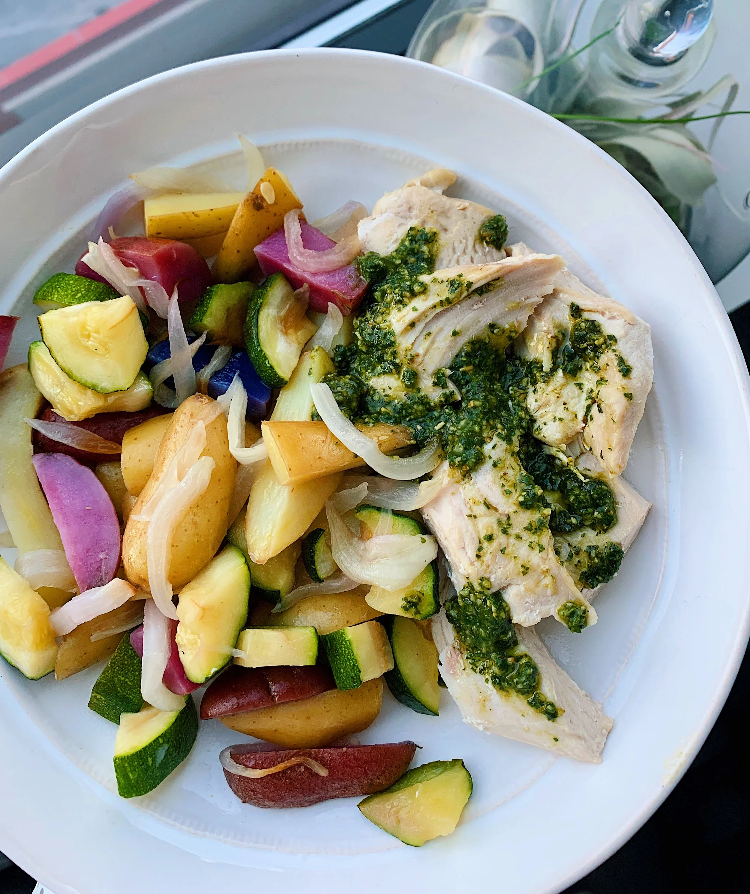 Add everything to a pan (pro tip - use parchment paper for an easy clean up!) drizzle with olive oil + salt & pepper. Cook at 375 for ~20 minutes. Remove, top with pesto & enjoy.